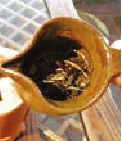 装茶抖烤 先将小陶罐在火塘上用文火烤热,然后放上适量茶叶抖烤,使其受热均匀,待茶叶叶色转黄并发出焦糖香时为止。