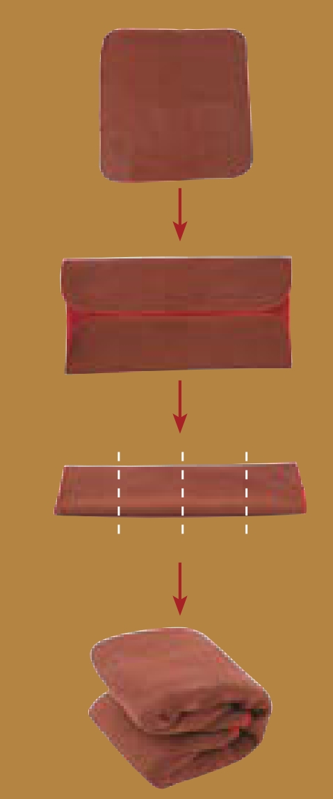 方法二:将茶巾等分四段分别向内对折;再等分四段,重复以上过程。茶巾有缝隙的一面朝向冲泡者位置。
