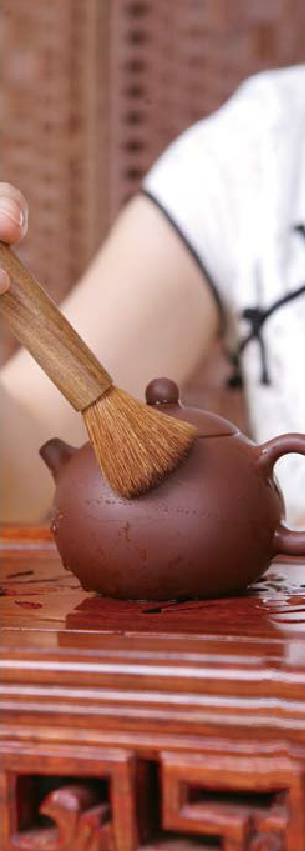 1.用养壶笔将茶汤均匀地刷在壶的外壁,对壶身全方位刷洗和保养。