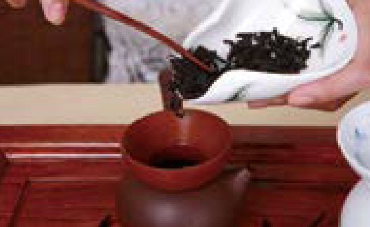 3 投茶:将茶漏放在壶口处,用茶匙将大红袍拨入壶中。