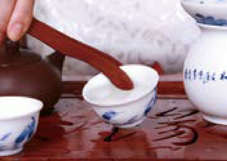 6 刮沫:用壶盖轻轻刮去壶口漂浮的浮沫,盖好壶盖。