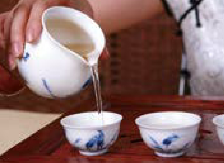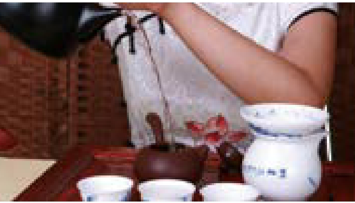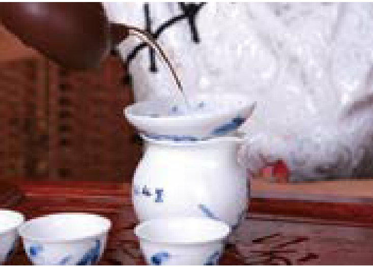 2 温具:向壶中注入沸水温壶。将温壶的水倒入公道杯中,温公道杯。再将公道杯中的水倒入品茗杯中,温品茗杯。
