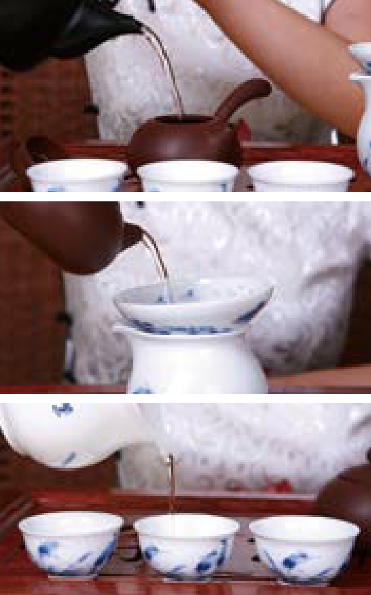 10 分茶:将公道杯中的茶汤均匀地分到每个品茗杯中。