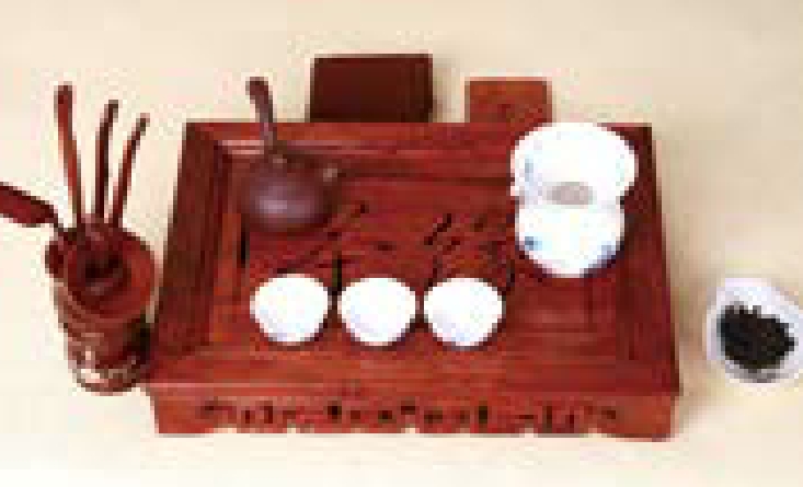 紫砂壶、公道杯、滤网、品茗杯、茶荷、茶道六用、茶盘。