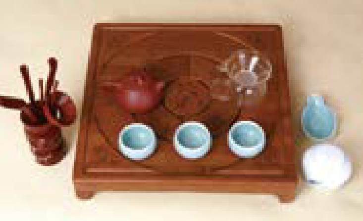 茶叶罐、紫砂壶、公道杯、滤网、品茗杯、茶荷、茶道六用、茶盘。