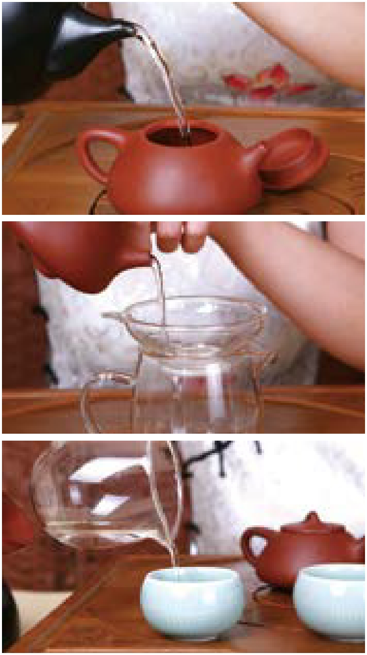 2 温具:倒入开水温壶,将温壶的水温烫公道杯,再将公道杯中的水倒入品茗杯。
