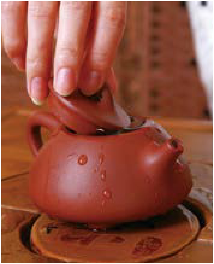 5 冲泡:冲水至满壶,刮去浮沫,盖上壶盖。约30秒。