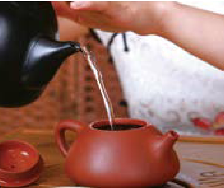4 润茶:向紫砂壶中注入半壶开水,并迅速倒入茶盘中。润普洱茶需一两次。