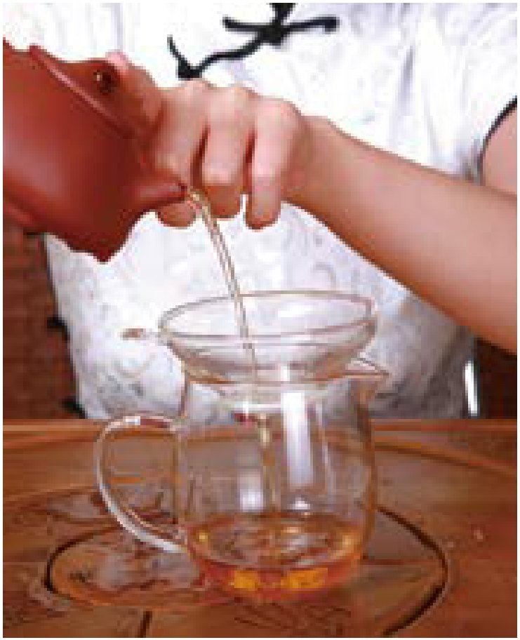 7 出汤:持壶快速将茶汤倒入公道杯中,控净茶汤。