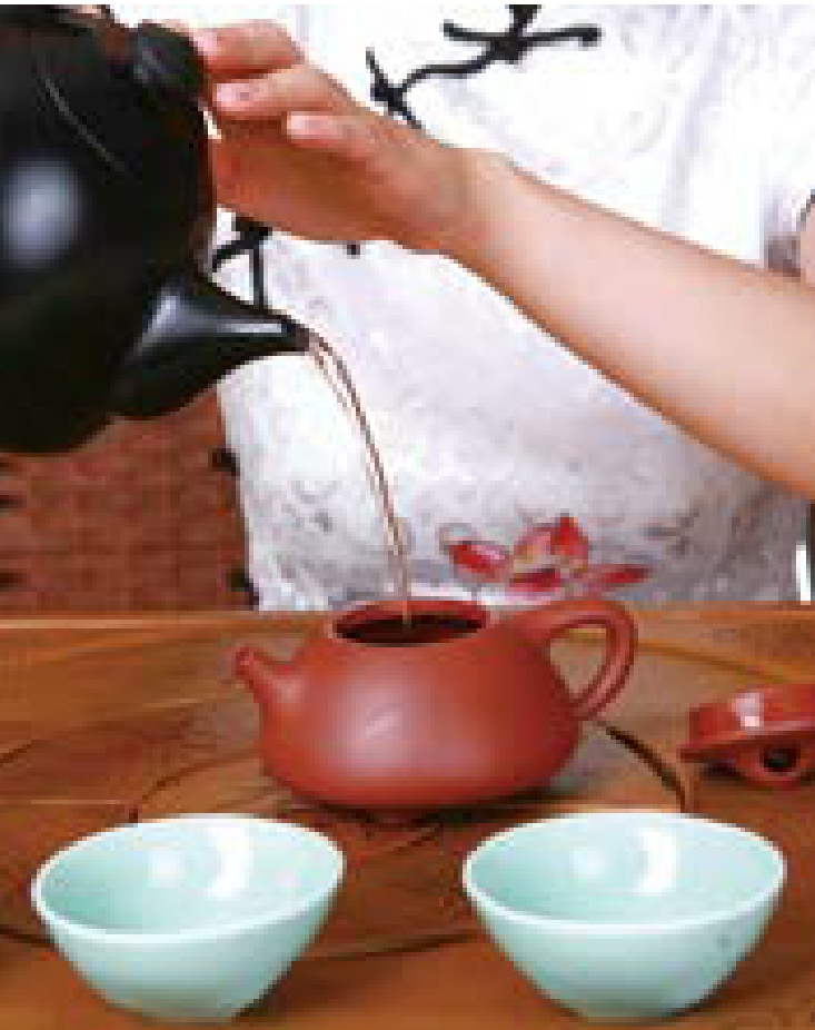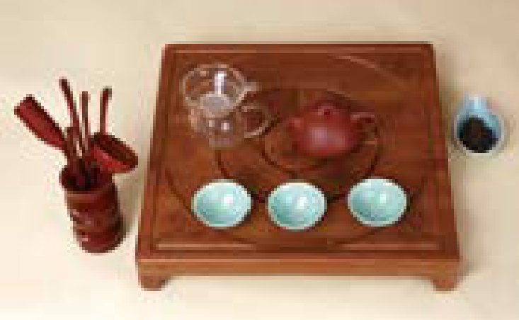 2 温具:先倒入热水温壶,再将温壶的水温烫公道杯,将公道杯中的水倒入品茗杯。