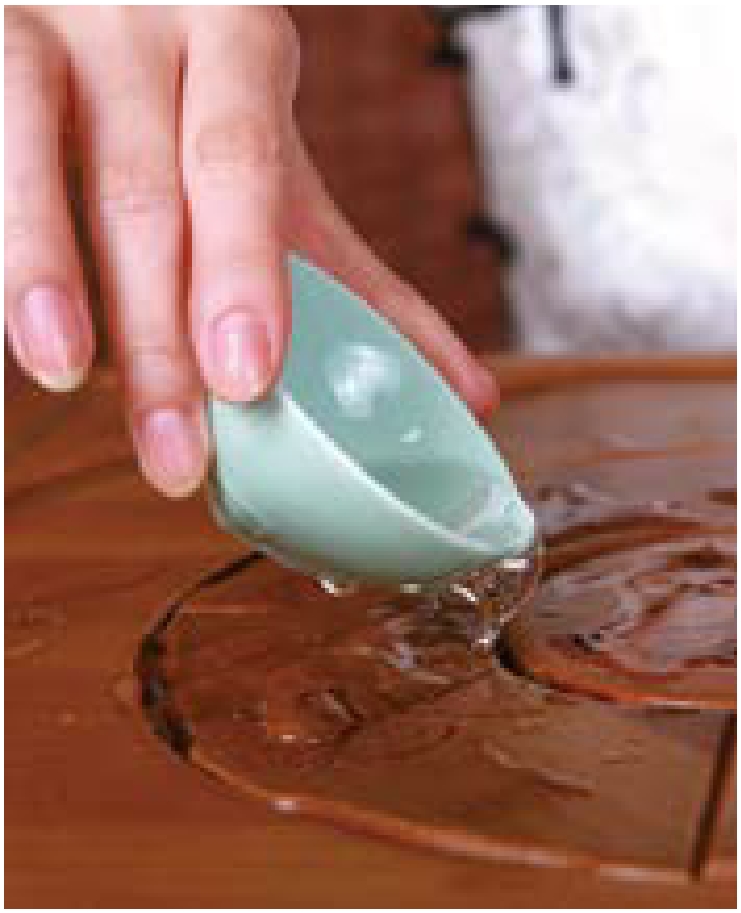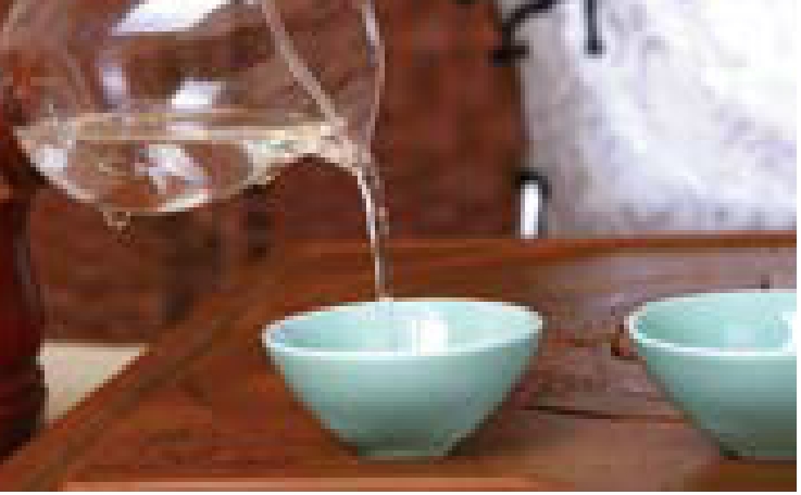 6 温杯:手持品茗杯,逆时针旋转,然后将温杯的水倒入茶盘。