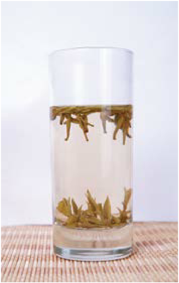 君山银针的“三起三落”是由于茶芽吸水膨胀和重量增加不同步,芽头比重瞬间变化而引起的。可以设想,最外一层芽肉吸水,比重增大即下降,随后芽头体积膨大,比重变小则上升,继续吸水又下降,于是就有了三起三落的奇观。