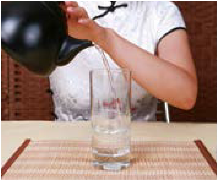 6 赏茶:茶叶从水的顶部慢慢沉下去,在水中伸展,俗称“茶舞”。刚泡好的君山银针并不能立即竖立悬浮在杯中,要等待3~5分钟,待茶芽完全吸水后,茶尖朝上,芽蒂朝下,上下浮动,最后竖立于杯底。有的茶芽可以三起三落,值得欣赏。