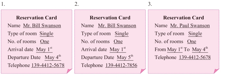 C Listen to the conversation in Part B again and decide which reservation card has recorded the correct reservation information.