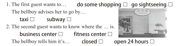 A Listen to two conversations between the hotel bellboy and the guest who is inquiring for information.Tick (√) the boxes to show the correct answers.