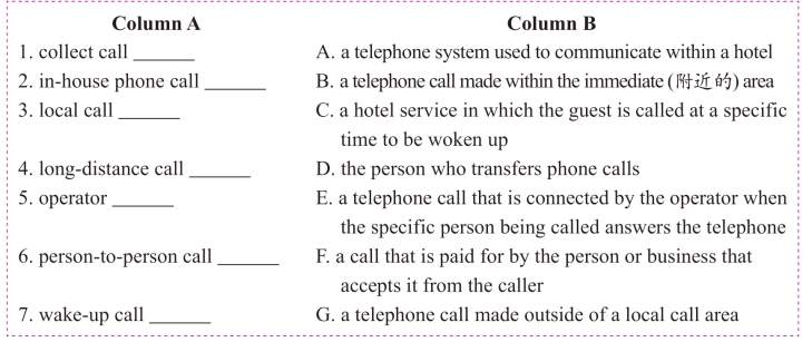 B Listen to four conversations in which certain hotel departments will be mentioned.Write down the numbers of the conversations next to the department names below that has been mentioned in corresponding conversations.Not all departments are used.