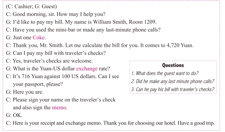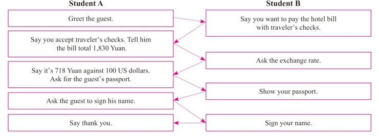 Student B:You are a hotel guest.Pay your bill using traveler’s checks.