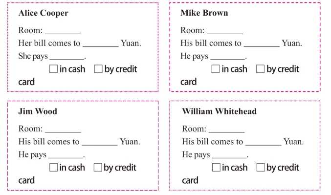 A Four guests are checking out of the hotel and paying their bills.Listen to the conversations between the guests and the hotel cashiers.Tick (√) the correct boxes and f ill in the blanks.