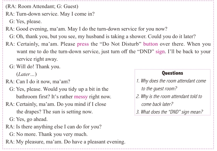 2.Student A:You are a room attendant and want to do turn-down service for the guest.
