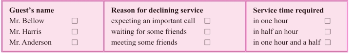 Student B:You are a guest.Ask the room attendant to return in two hours because you are busy right now.