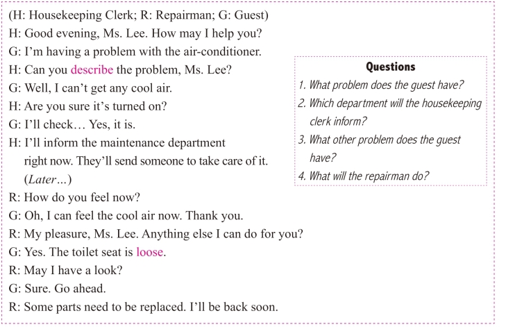 Student B:You are a housekeeping clerk.Answer the call and tell him you will inform the maintenance department.