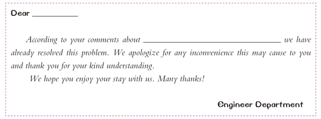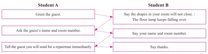 Student B:You are a housekeeping clerk.Answer the call and tell her you will send for an electrician right away.