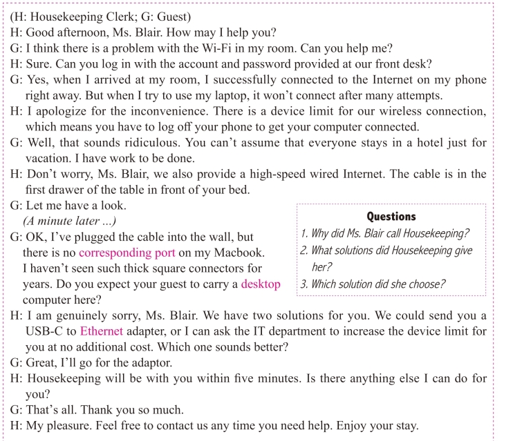 Student B:You are a housekeeping clerk.Answer the phone and help the guest.