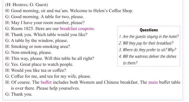 A What to say.Guests are coming to a buffet breakfast.What might the guests and the hostess say?