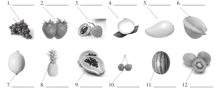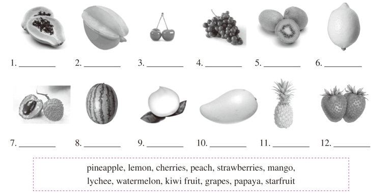 A Do you know the following fruit? Label the pictures with the correct words from the box below.Then listen and repeat those words.
