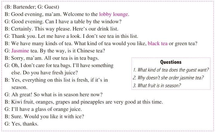 Student A:You are in a bar and want to have juice.Ask the bartender what fruit is in season and then order lemon juice.