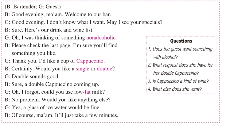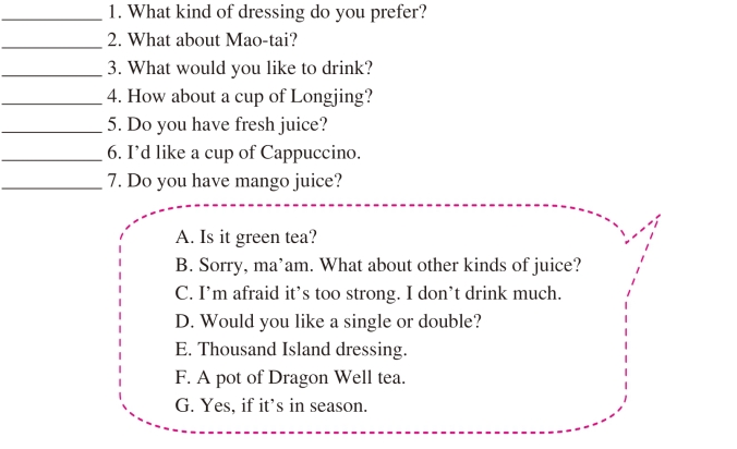 81.3 Match the restaurant employee’s questions with the guest’s responses.