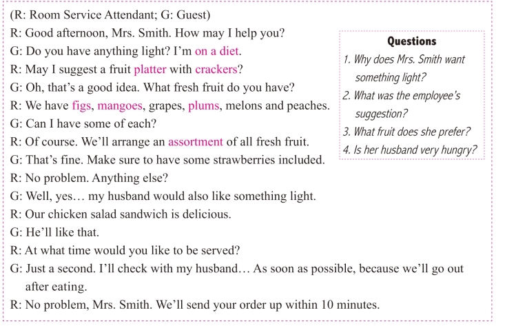 Student A:You are a hotel guest and call room service to say you are on a diet and want something light.You take the clerk’s suggestion and order a fruit platter and a carton of yoghurt (酸奶).