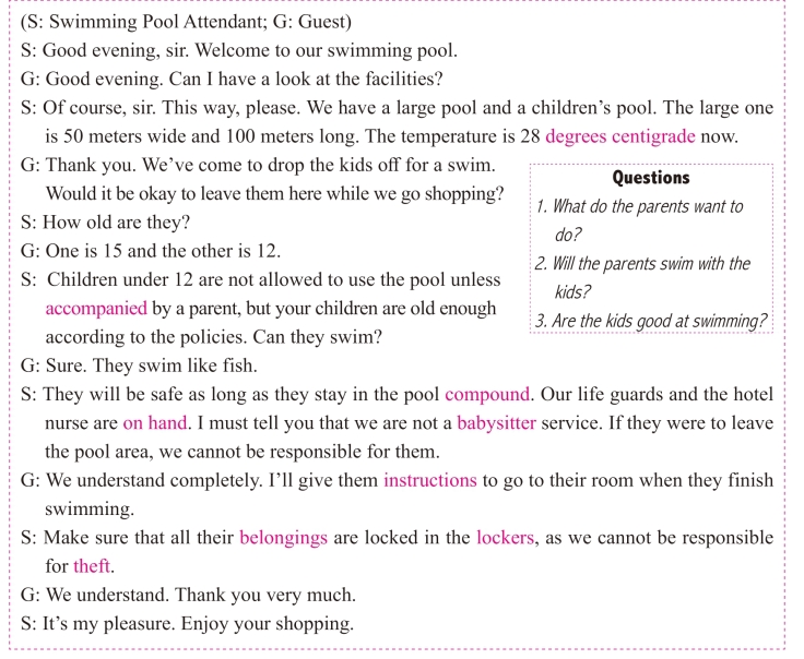 92.3 Read the following conversation between a swimming pool attendant and a guest.Complete the sentences with the expressions in the box below.____________