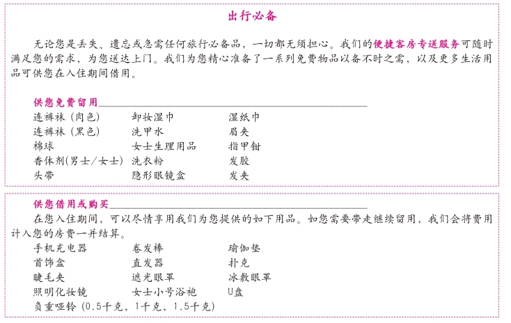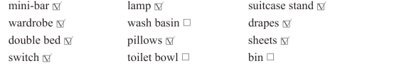 9.clothes hanger 10.shower cap 11.iron 12.hair drier
