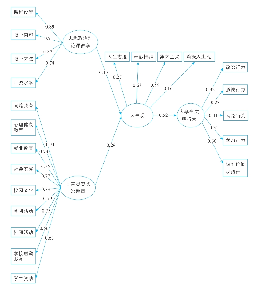 思想政治理论课教学与日常思想政治教育是大学生思想政治教育开展的主渠道与主阵地,对大学生人生观教育具有举足轻重的作用。为进一步考察和验证思想政治理论课教学与日常思想政治教育对大学生人生观的实际影响,我们采用结构方程模型进行分析。数据分析发现,思想政治理论课教学与日常思想政治教育均正向显著影响着大学生的人生观状况,即思想政治理论课教学与日常思想政治教育开展得越好,大学生对其越满意,大学生的人生观就越积极。相比较而言, 日常思想政治教育对大学生人生观的培养积极影响较大,标准化系数为0.29,思想政治理论课教学积极影响大学生人生观的标准化系数为0.13。分析还发现,大学生的人生观正向显著影响着大学生的日常文明行为,标准化系数为0.52,大学生人生观越积极,他们的日常行为表现越好。此结构方程模型综合说明:思想政治理论课教学与日常思想政治教育通过影响大学生的人生观而影响着大学生的日常行为表现,思想政治理论课教学与日常思想政治教育对大学生人生观及其行为表现发挥积极影响。