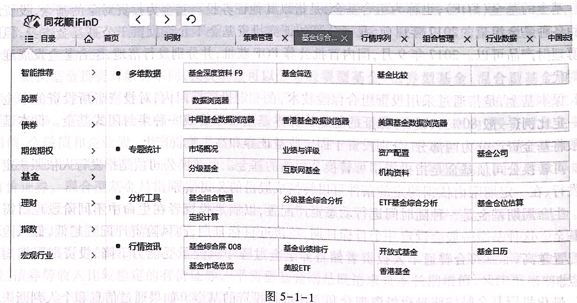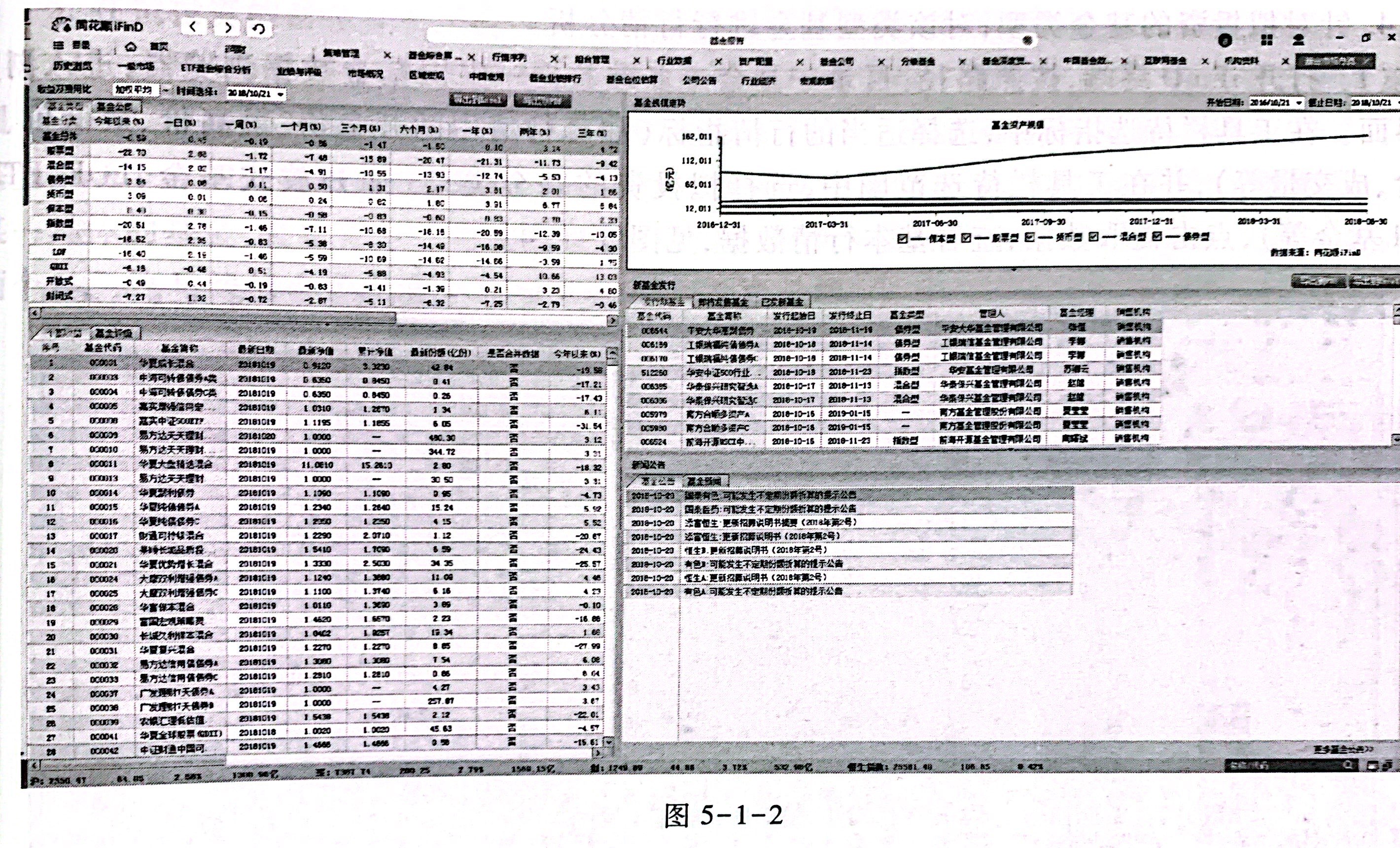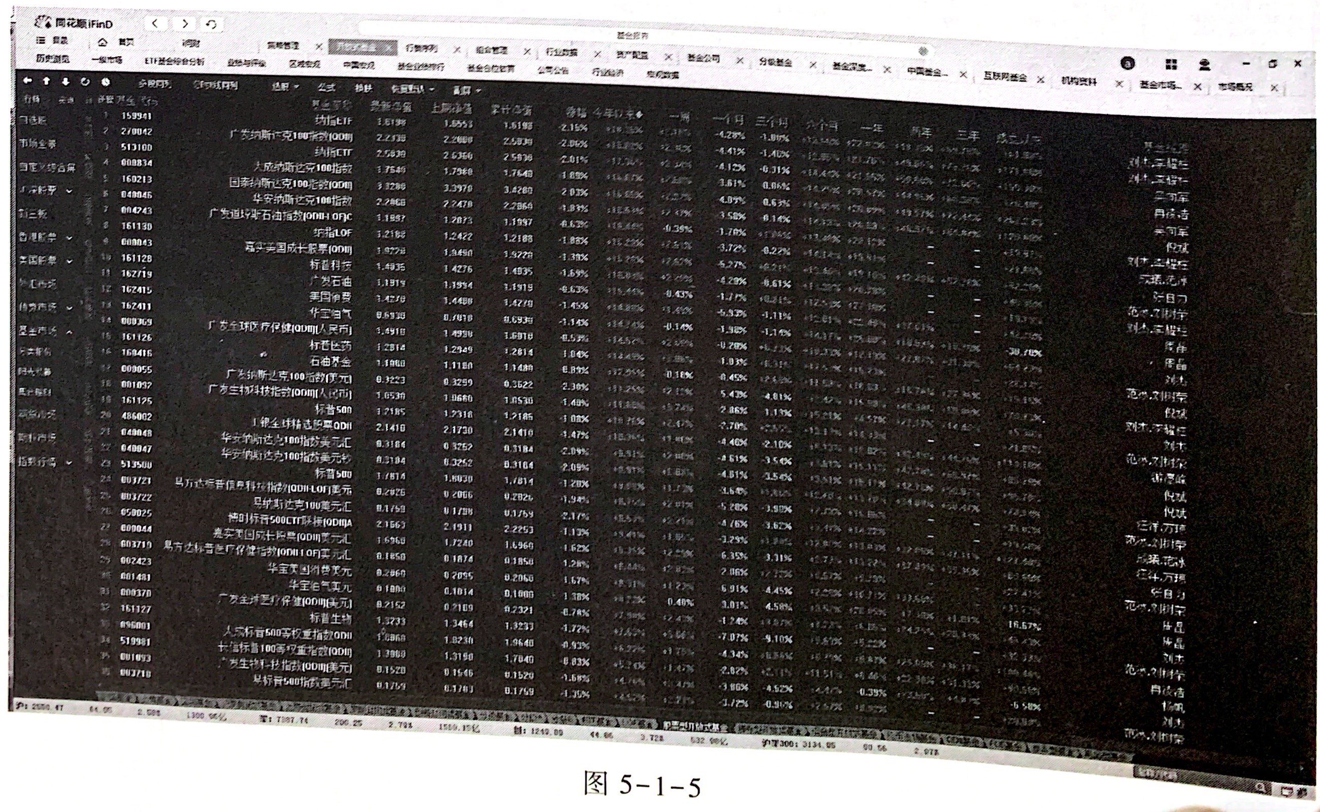 (2)打开iFinD终端,按照路径:目录一行情一基金行情一某一类型基金(如股票型开放:基金),进人该类型基金的行情界面。按照涨幅、今年以来、一周、一个月、一年等指标进行排序 查看其基本行情,针对不同类型基金进行简要对比分析,见图 5-1-5。