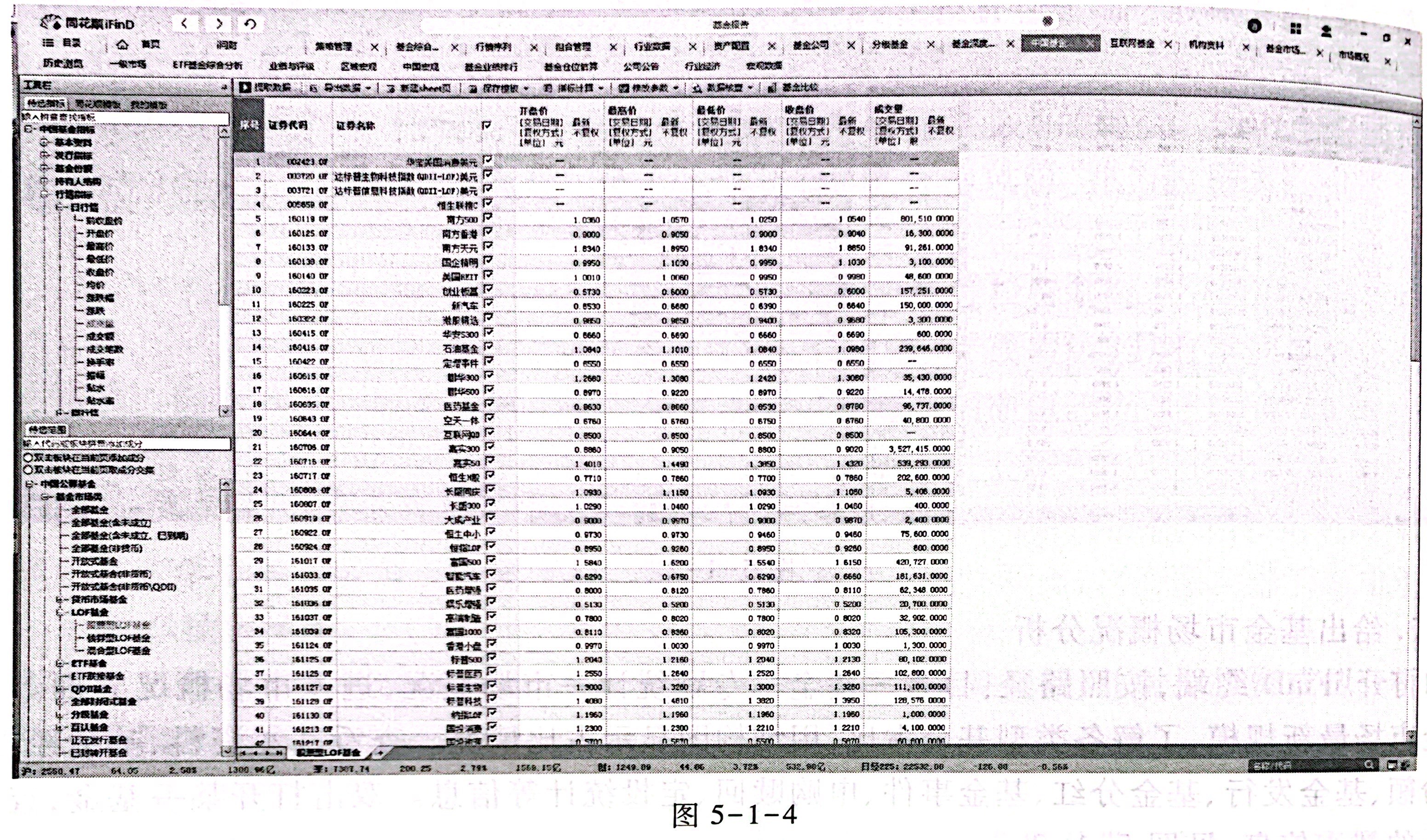 (1)打开 iFinD 终端,按照路径:目录一基金一多维数据一中国基金数据测览器,进人浏览 器界面。在工具栏待选指标中,选择适当的行情指标(如日行情中的开盘价、最高价、最低价、收盘价、成交量等),并在工具栏待选范围中,选择拟投资的基金类型(如开放式基金、LOF、ETF、 QDII 基金等),点击提取数据,查看基本行情数据,见图 5-1-4。