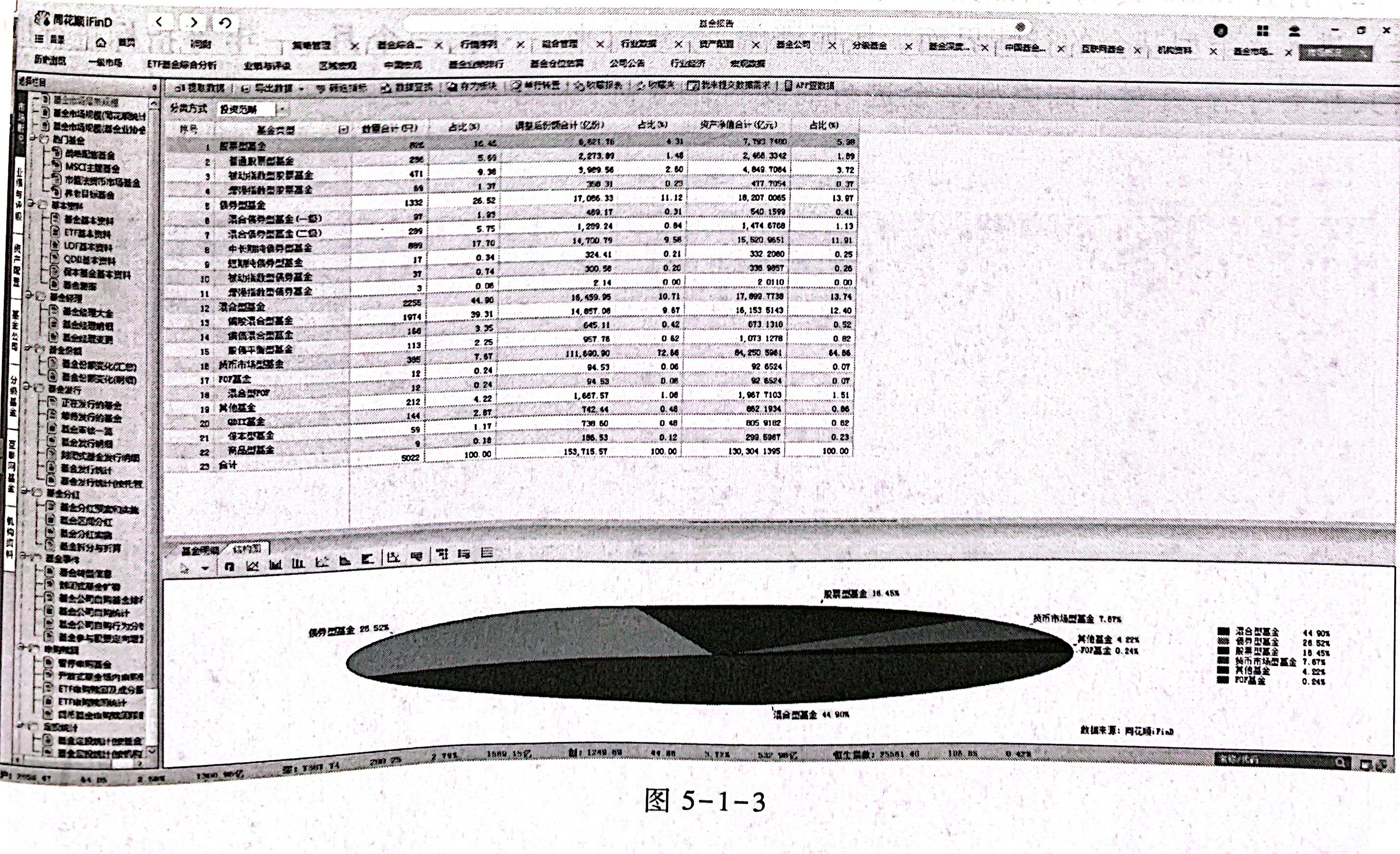 打开 iFinD 终端,按照路径:目录一基金一专题统计一市场概况,进入市场概况界面。查看基金市场最新规模,了解各类型基金占比,用结构图显示占比指况。查看基本究料、基金经理、基金份额、基金发行、基金分红、基金份额、申购映回、定投统计等信息。双击打开某一基金,查看该基金的基本信息,见图5-1-3。