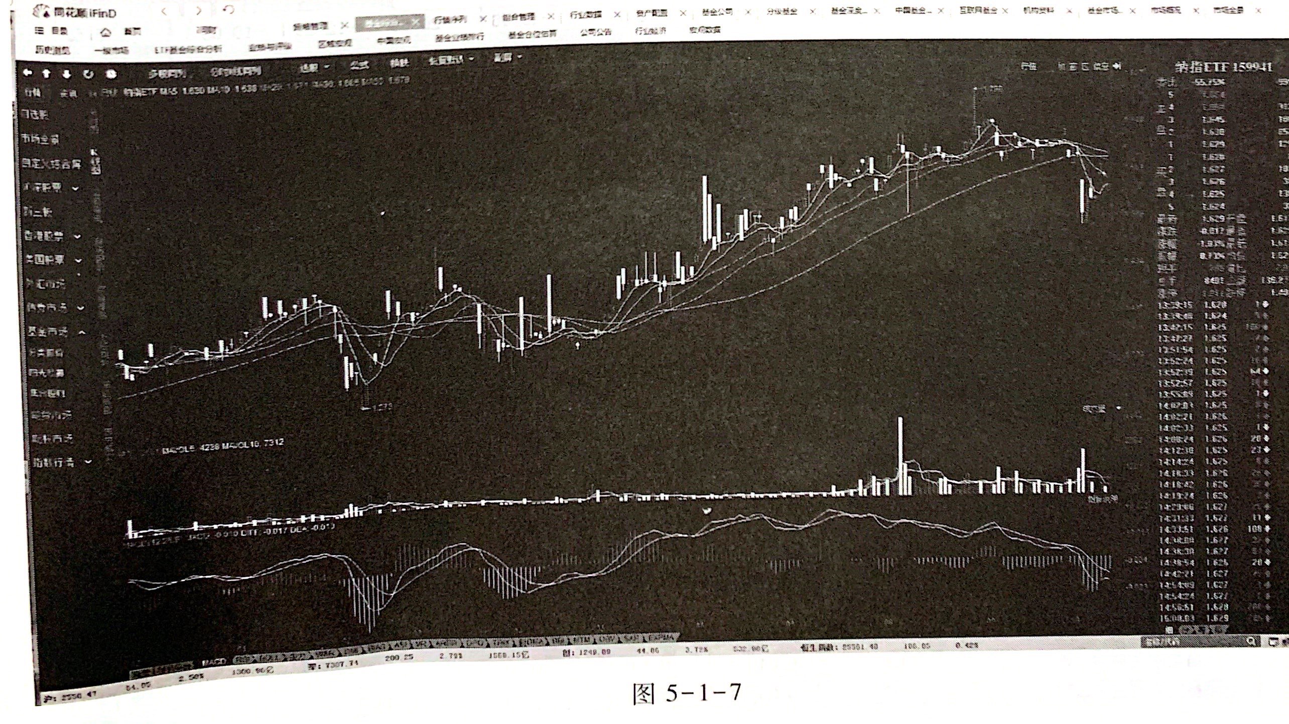 (1)打开 iFinD 终端,按照路径:日录一基金一行情家讯一基金综合露,进入综合联界面,见 图5-1-6。双基打开基金指数,查看七分时图和K线图。退回基金综合评,点击行情界面左侧基金市场下方的分类报价(或基金业绩排行),选择某一分类基金(如股票型开放式基金),打开某一具体的基金,查存其分时图和K线图,见肉5-1-7。根据股票实验中的技术分析实验,我出一两个典型的K线组合图和两个典型形态,进行简要分析。