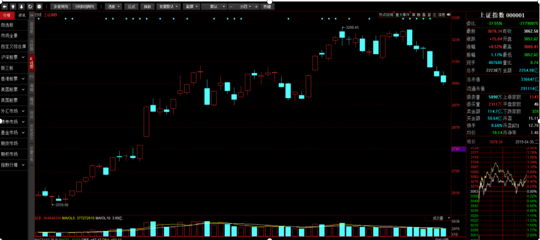 (2)首先,在行情列表中找到所需要分析的市场对象报价(这里以上证指数为例);其次,双击鼠标左键,进入所需分析对象的K线图页面,研究K线图的相关知识。见图 4-4-39。