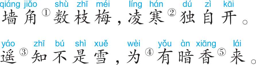 ①角:角落。②凌寒:迎着寒风。③遥:远远的。④为:因为。⑤暗香:指梅花的幽香。
