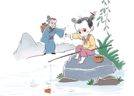 一个头发蓬乱的小孩子正在学垂钓,侧身坐在莓苔之上,青草遮住了他的半个身子。过路的人向他打听事情,他老远就招着小手,生怕鱼儿受惊不上钩而不敢回答路人。