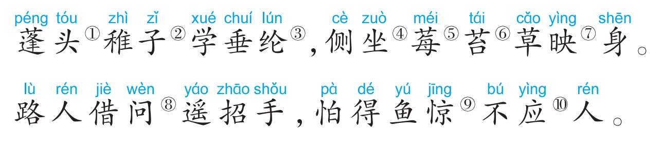 ①蓬头:形容头发很乱。②稚子:小孩子。③垂纶:钓鱼。纶,钓鱼用的丝线。④侧坐:侧着身子坐。⑤莓:一种野草。⑥苔:苔藓。⑦映:掩映。⑧借问:敬辞,用于向人打听事情。⑨惊:受惊吓。⑩应:回答,这里指理睬。