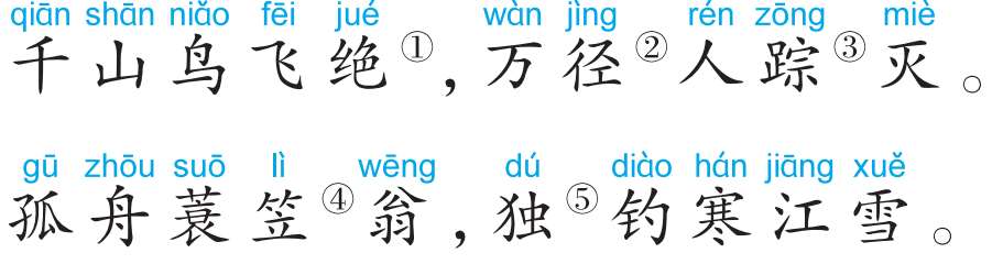 ①绝:无,没有。②径:小路。③踪:踪迹,脚印。④蓑笠:蓑衣和斗笠。⑤独:独自。
