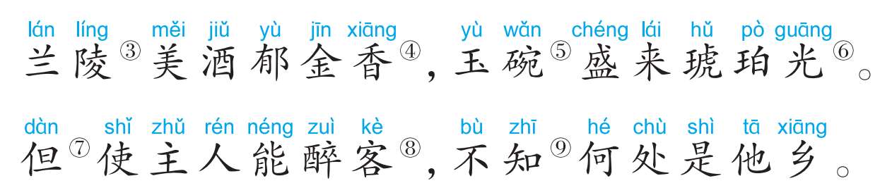 ①客中:作客他乡。②作:写作。③兰陵:古地名,在今山东枣庄一带。④郁金香:一种香草,可用来泡酒,泡后的酒呈金黄色。⑤玉碗:用玉做的碗。⑥琥珀光:呈现琥珀的色泽。⑦但:只要。⑧醉客:使客醉。让客人喝醉。⑨不知:不知道。