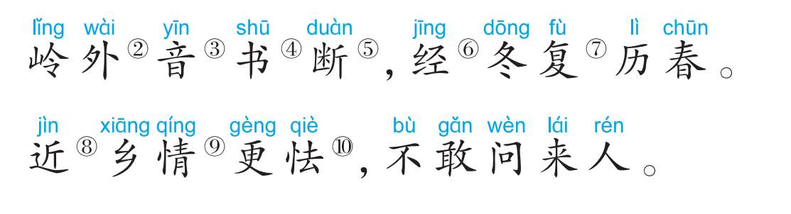 ①汉江:汉水,长江最大支流。源出陕西,经湖北流入长江。②岭外:五岭以南的广东省广大地区,通常称“岭南”。③音:消息。④书:信。⑤断:断绝。⑥经:经历。⑦复:又。⑧近:接近。⑨情:情感。⑩怯:胆怯,紧张。