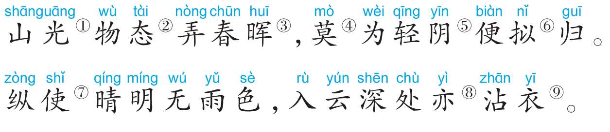 ①山光:山中景色。②物态:万物的姿态。③春晖:春天的阳光。④莫:不要。⑤轻阴:天气阴。⑥拟:打算。⑦纵使:即使。⑧亦:也。⑨沾衣:打湿衣服。