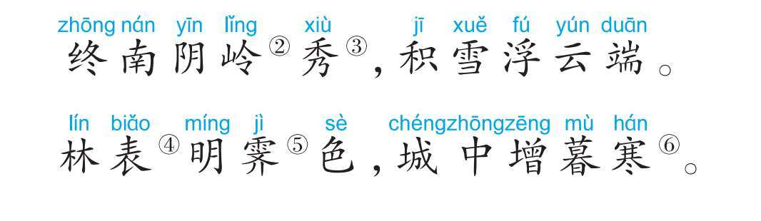 ①终南:终南山,在长安城南。②阴岭:山北面的山岭。③秀:秀丽。④林表:树梢。⑤霁:雪后初晴。⑥暮寒:傍晚时分的寒气。