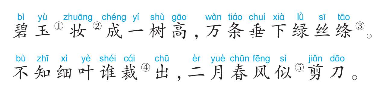 一棵高高的柳树,好像是用绿色的玉装扮出来的。千万条柳枝垂下来,就像用绿色的丝线编织而成。这新长出来的柳条是谁裁剪出来的呢?原来是像剪刀一样的春风裁剪出来的啊!