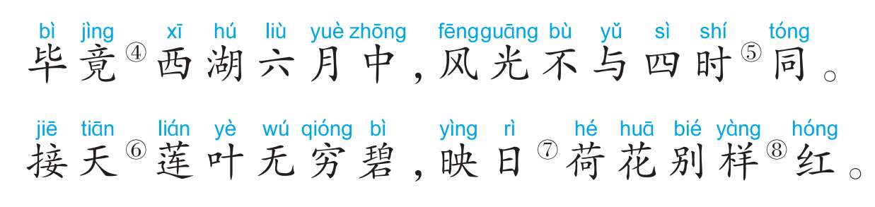 杨万里(1127—1206),字廷秀,学者称“诚斋先生”,吉水(今属江西)人,南宋诗人。绍兴年间进士,曾任秘书监。一生关心人民生活和国家命运,正直敢言。所写诗歌构思新巧,语言通俗明畅而自成一家,被时人称为“杨诚斋体”。杨万里与陆游、范成大、尤袤齐名,称“中兴四大家”或“南宋四大家”。代表作除本首外还有《小池》《宿新市徐公店》《稚子弄冰》《舟过安仁》等。